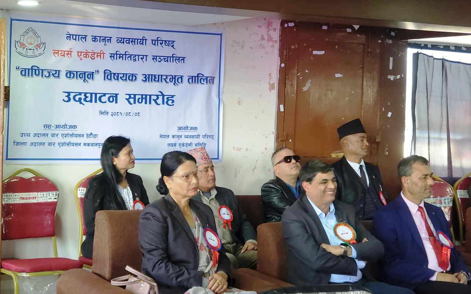 मकवानपुर । उच्च अदालत बार र जिल्ला बार एशोसियसन हेटौंडाका अधिवक्ताहरुलाई हेटौंडामा वाणिज्य कानून विषयक तालिम दिन शनिबार देखि शुरु गरिएको छ ।