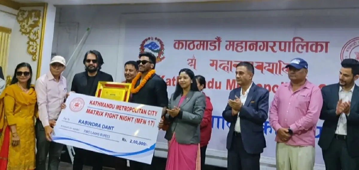 २७ साउन, काठमाडौं । हालै भारतको नोएडामा भएको म्याट्रिक्स फाइट नाइट (एमएफएन १७) का विजेता नेपाली फाइटर रवीन्द्र ढाटलाई काठमाडौं महानगरपालिकाले नगद सहित सम्मान गरेको छ ।