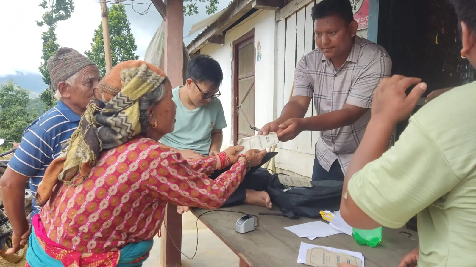 घरघरमा पुगि लाभग्राहीलाई बायोमेट्रिक गराउँदै वडा अध्यक्ष उत्तम वाईबा र सचिव इन्द्र बहादुर जिरेल