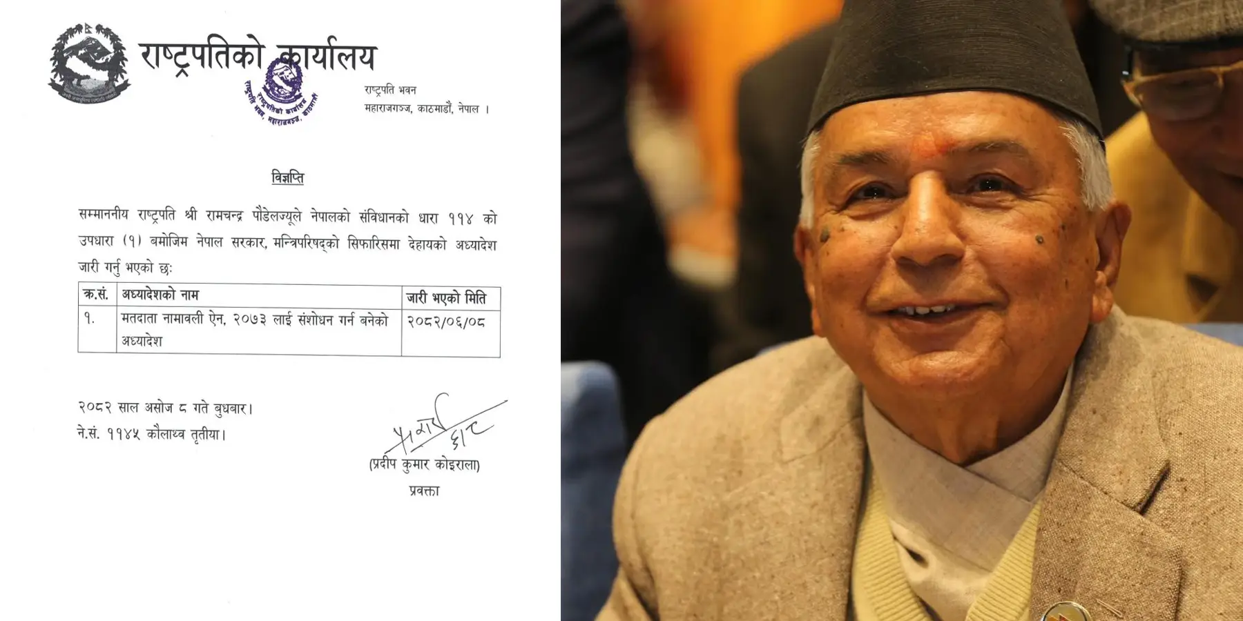 राष्ट्रपति पौडेलले संविधानको धारा ११४को उपधारा १ बमोजिम मन्त्रिपरिषद्‌को सिफारिसमा मतदाता नामावली ऐन,  २०७३ लाई संशोधन गर्न बनेको अध्‍यादेश जारी गर्नु भएको हो ।