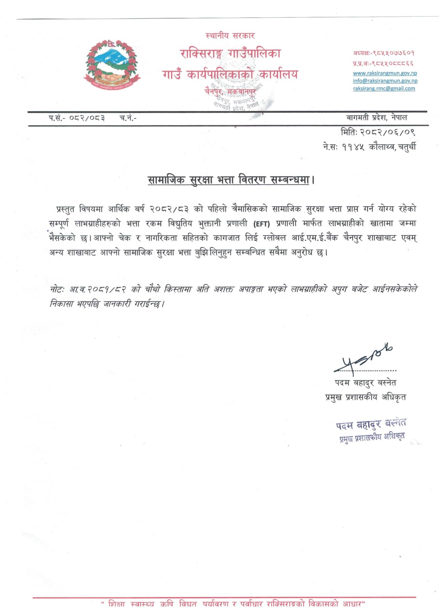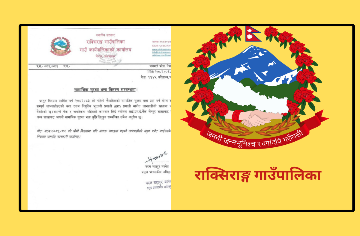 असोज ९, राक्सिराङ्ग। राक्सिराङ्ग गाउँपालिकाले कारणबस ढिलाइ हुने भनिएको सामाजिक सुरक्षा भत्ता वितरण दशैँ अगाडी नै गर्ने भएको छ ।